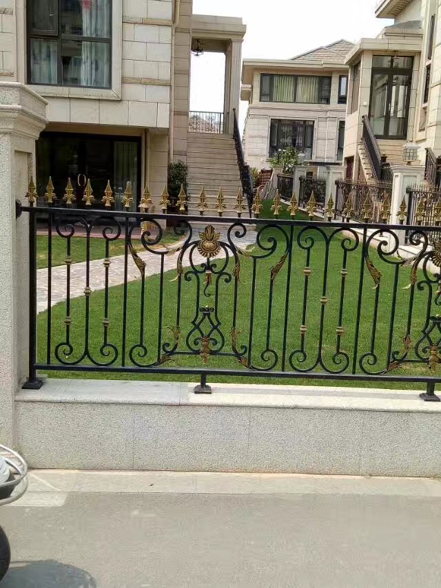 圍欄由黑色金屬制成,設(shè)計(jì)非常精致,充滿了復(fù)雜的卷曲和花紋圖案,并且在一些關(guān)鍵部位有金色的裝飾,增添了一絲華麗感。圍欄的頂部有尖銳的裝飾性尖刺,顯得非常典雅。
