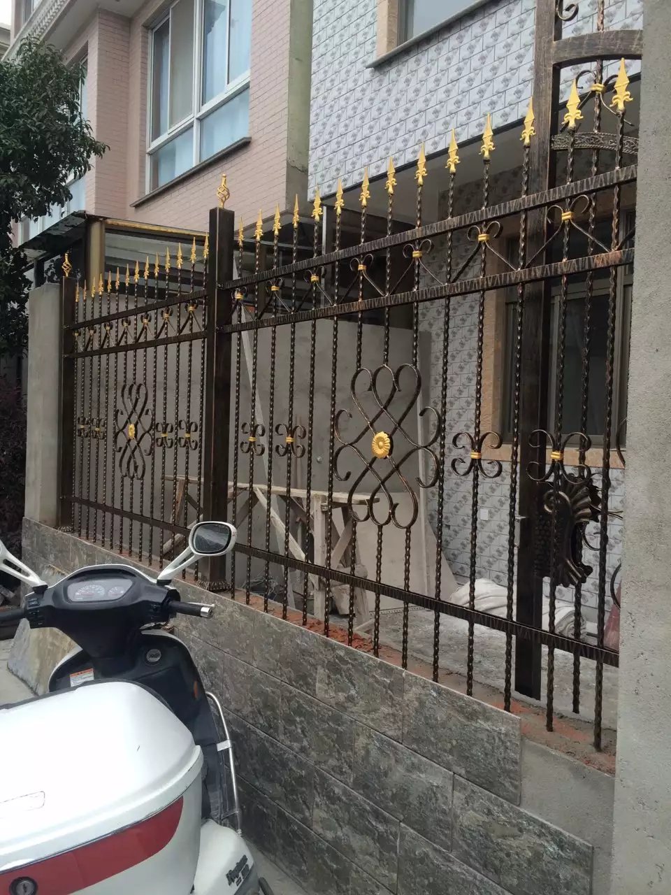 圍欄由黑色金屬制成,設(shè)計非常精致,充滿了復(fù)雜的卷曲和花紋圖案,并且在一些關(guān)鍵部位有金色的裝飾,增添了一絲華麗感。圍欄的頂部有尖銳的裝飾性尖刺,顯得非常典雅。