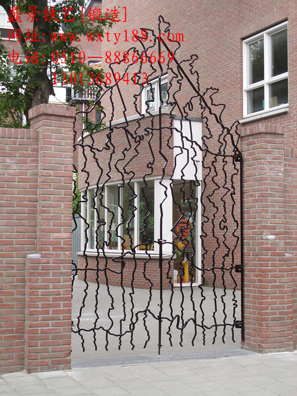 該款編號為TYM-012型號的鐵藝門是無錫鐵藝護(hù)欄廠鐵藝為別墅、庭院、花園而設(shè)計(jì)制造的一款現(xiàn)代非主流的鐵藝大門。該鐵藝門運(yùn)用凹凸沒有規(guī)律的曲線作為欄桿,保留門的造型和外框。沒有規(guī)律的曲線的交錯(cuò)上演了極其擁有創(chuàng)造力的場景。門不像門,像是從漫畫里走出來的城堡。讓人覺得可愛、可笑。這是一道風(fēng)景,別有用心的吸引了人們的視線。從門的每個(gè)地方都可以看出活潑、天真、想象、創(chuàng)造……,此門看似簡單,實(shí)則繁雜,線條似乎是沒有規(guī)律的,但是當(dāng)組成門的時(shí)候,又不能不協(xié)調(diào),所以處處透露著工匠的細(xì)心。